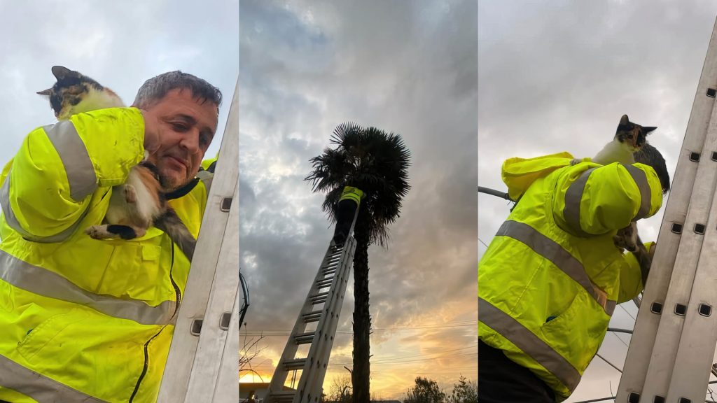 Me qetësi, profesionalizëm dhe kujdes të madh, ai u ngjit në majën e pemës, për të shpëtuar kafshën e vogël. Pas disa përpjekjesh të kujdesshme, macja u mor në krahë dhe u soll e sigurt poshtë, duke marrë duartrokitjet dhe duart e ngrohta të banorëve të pranishëm.